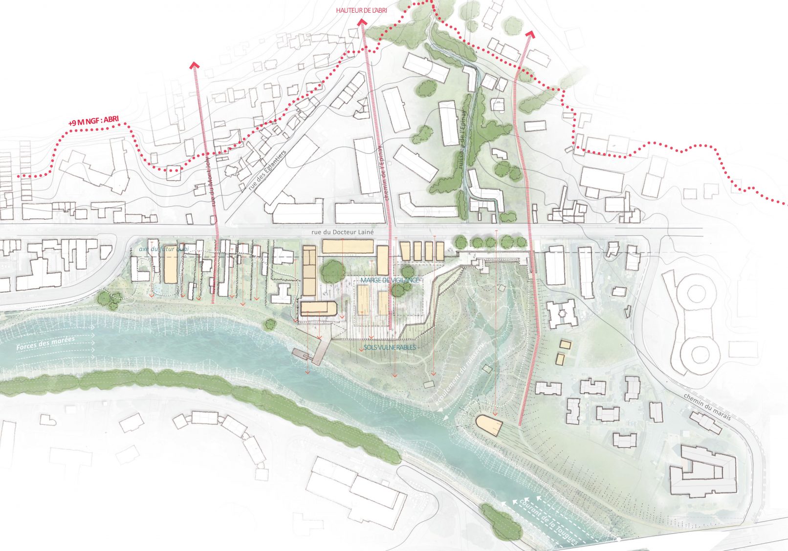 Le projet s’énonce comme l’expérimentation d’un réaménagement urbain qui suit et s’ajuste aux niveaux d’attention à l’inondation définis (vulnérabilité, vigilance, abri) et sur différentes temporalités : temps 1 sur une génération humaine, temps 2 sur plusieurs générations avec une submersion marine liée au réchauffement climatique. Le projet ici présenté se décline alors en cinq familles d’interventions urbaines, architecturales et paysagères :