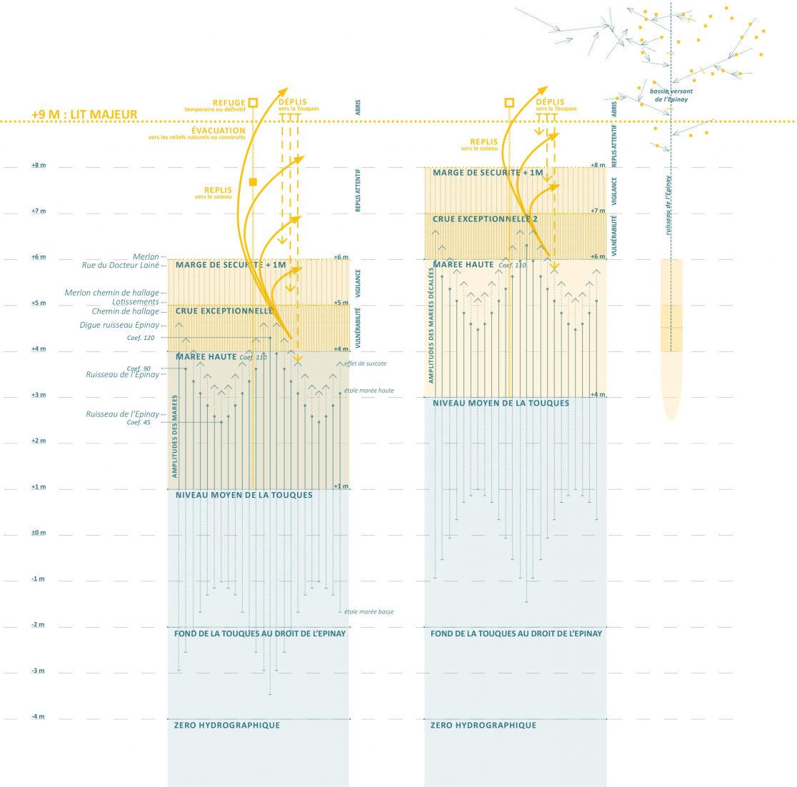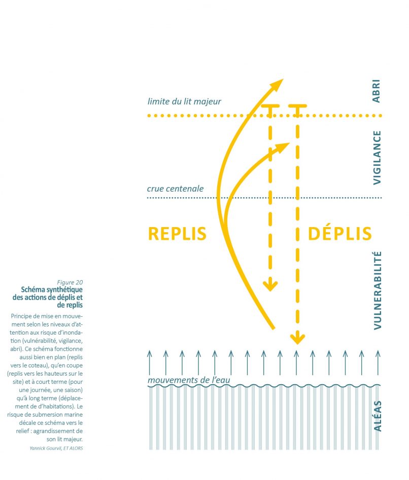 Entre ces lignes de niveaux, il est question de concevoir divers mouvements de replis/déplis, engageant sur le territoire de nouveaux rythmes d’usage, souples et sensibles aux variations spatiales et temporelles du milieu habité. Le projet prévoit d’initier une programmation architecturale et urbaine adaptable à la montée des eaux, qu’elle soit soudaine et temporaire (inondation) ou progressive (submersion), mais aussi adaptable aux usages du territoire et à ses rythmes saisonniers, à l’évolution de la population et à ses nouveaux modes d’habiter et travailler.