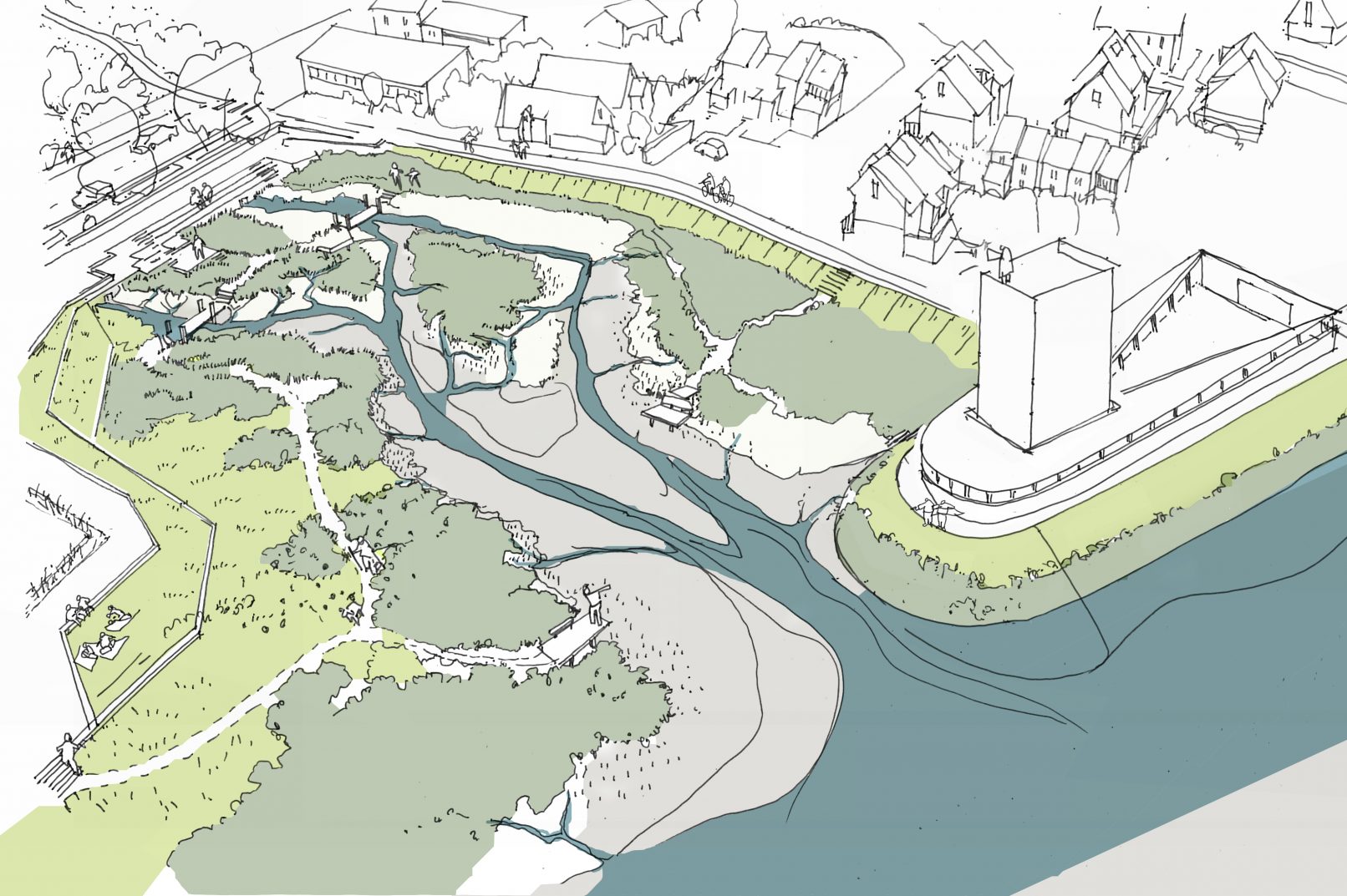 lieu de sa confluence avec l’Épinay. Il s’agit d’un site qui entretient une proximité privilégiée avec l’eau (qu’elle puisse être attrayante ou menaçante), mais que la composition urbaine ignore actuellement complètement. Notre projet propose alors de transformer ce lieu de confluence en un nouvel espace public,